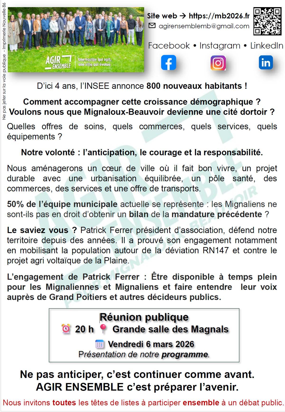 Réunion publique (5 février 2026)THEMES : relations intergénérationnelles, éducation, santé, vie associative📣 Seconde réunion publique de la liste « AGIR ENSEMBLE POUR MIGNALOUX-BEAUVOIR » aux cotés de Patrick FERRER. 👉 Au programme de la soirée: relations intergénérationnelles, éducation, santé, associations, pour améliorer notre "bien vivre ensemble ". Mignaloux-Beauvoir mérite un projet ambitieux, cohérent et tourné vers l’humain. ✅ Avec Patrick FERRER nous faisons le choix : du dialogue, de la proximité, d’une nouvelle gouvernance transparente fondée sur l’écoute et la co-construction. Rejoignez "AGIR ENSEMBLE POUR MIGNALOUX-BEAUVOIR "
