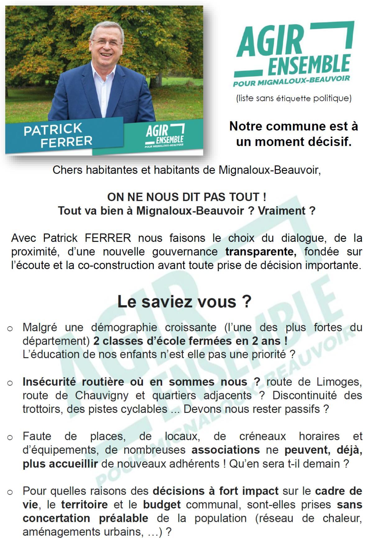 👉Dernière ligne droite avant les élections municipales. 🤝Depuis le début de cette campagne, nous avons fait un choix clair : aller à la rencontre des habitants, écouter, échanger et construire avec vous POUR AGIR ENSEMBLE POUR MIGNALOUX-BEAUVOIR aux cotés de Patrick FERRER.